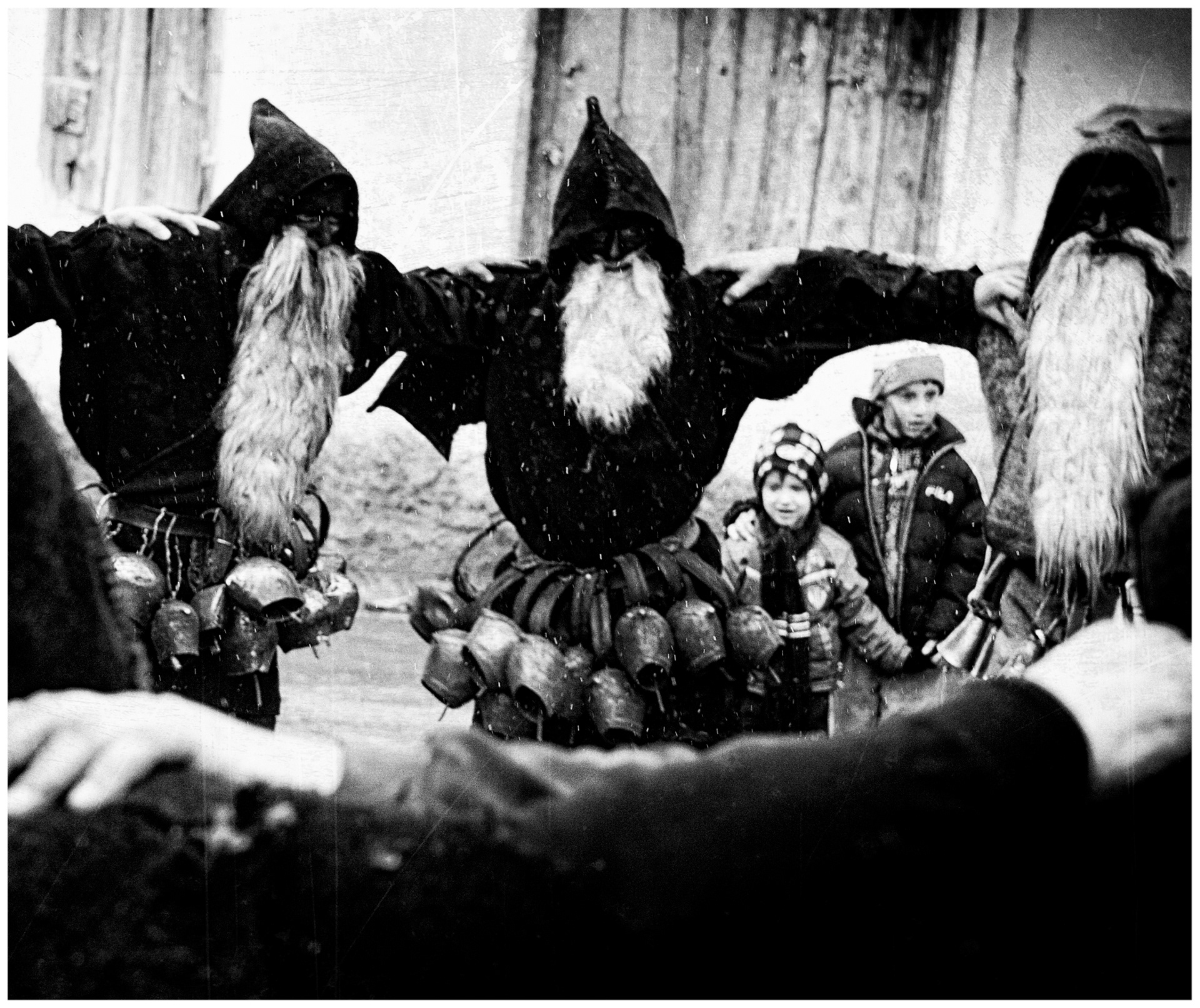 Every year, on January 14th, a group of men gathers to become the Dzolomari. They begin by preparing in their homes, painting their faces with dead coals from the fire. Next, they put on a hooded black or brown garment called a “chulavka” made from wool woven on a traditional loom. They also wear wool beards and mustaches, rough-hewn, heavy masks. Lastly, they drape ten or more heavy bells from belts around their waists. Dzolomari gathers in the middle of the village in the evening. Driven by adrenaline and energy, they jump and stamp their feet. They whack their wooden canes against the ground and knock the heavy bells around their waists together. The men dance aggressively, making lots of noise to chase away the evil spirits and keep them from the village for the entirety of the year. The Dzolomari clang their bells, slap their canes, and stomp their feet to wake the people from winter slumber.